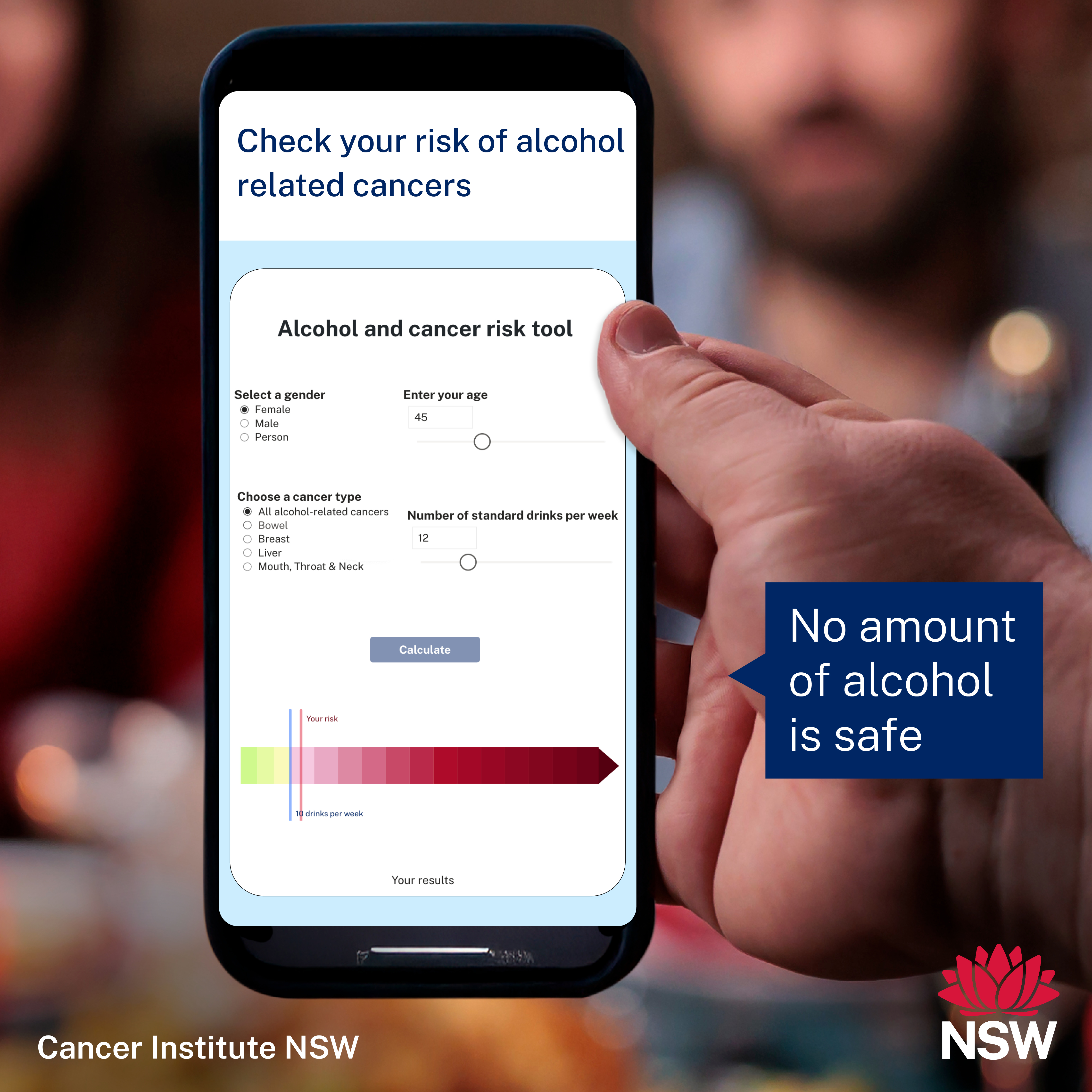 Disclaimer: Alcohol-related breast cancer risk was calculated for females. The data is not available for people who select ‘male’ or ‘person’. The age on the Tool starts at 25 years due to a 10-year lag time between exposure to alcohol consumption and cancer risk. Contact the Cancer Institute NSW for more information.